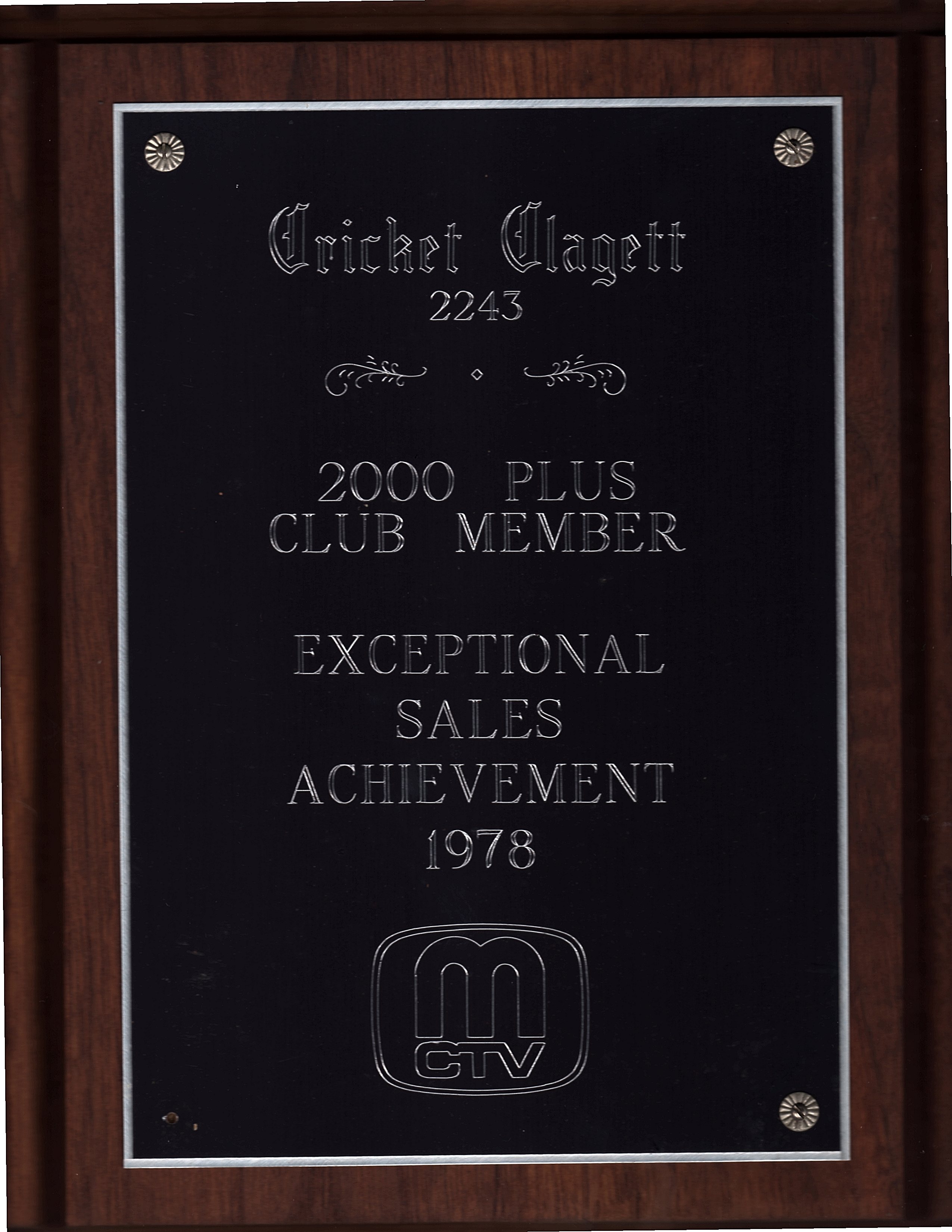 Image: “MCTV Exceptional Sales Achievement 1978 Placard Awarded to Cricket Clagett 2243, 2000 Plus Club Member,” 1978, CC BY-SA 4.0 International, from “Awakening with Planet Earth,” https://awakeningwithplanetearth.com ..